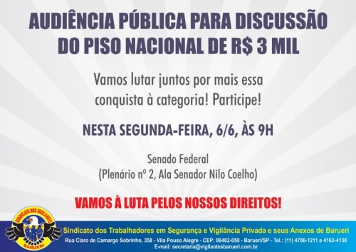 Na próxima segunda-feira, 6 de junho, haverá Audiência Pública, em Brasília, para apresentação e lançamento do Projeto de Lei do Piso Nacional de R$ 3 mil para os profissionais de segurança privada do Brasil.