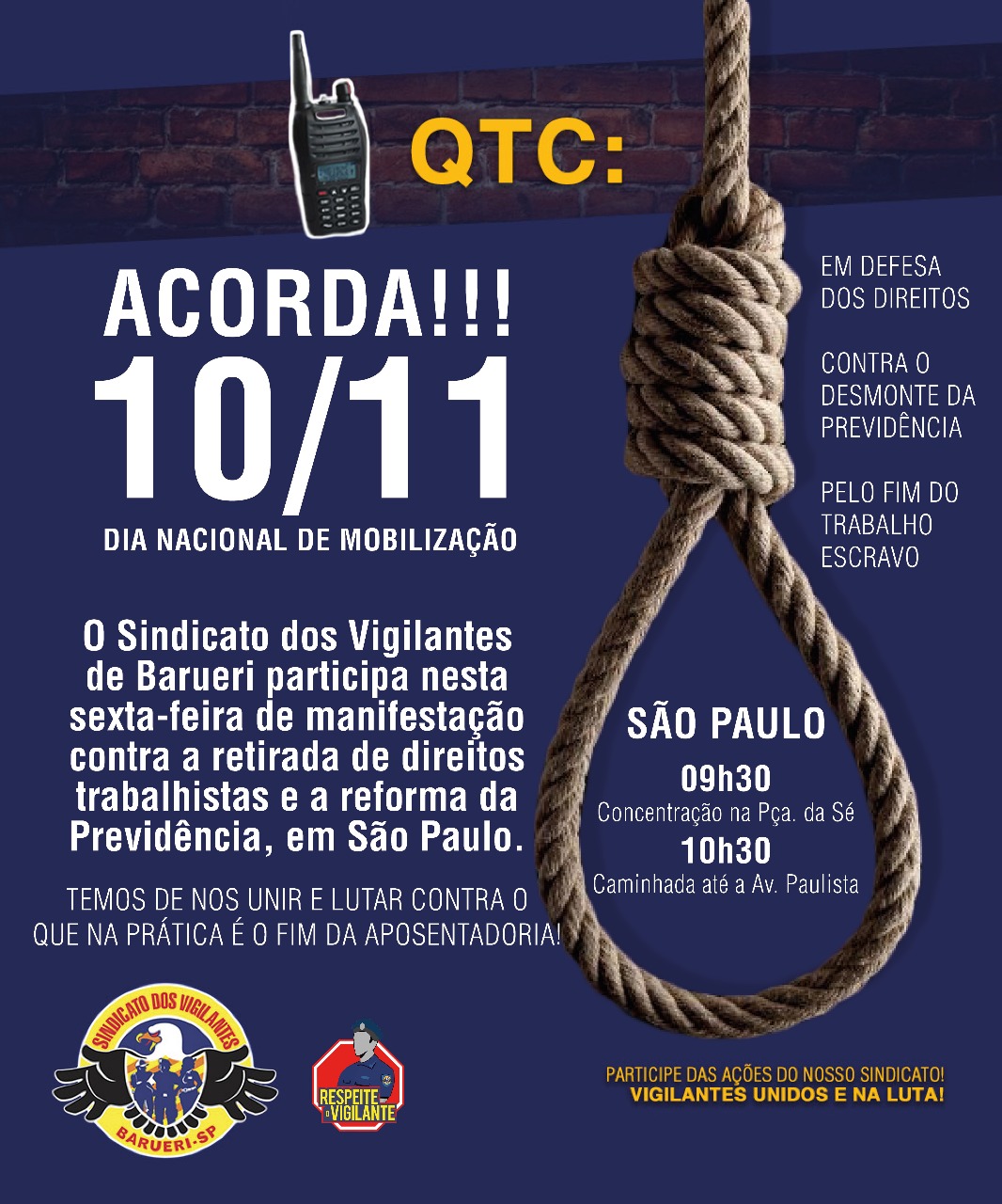 Em São Paulo, o principal ato deste Dia Nacional de Paralisação contra a reforma da Previdência terá concentração na Praça da Sé, a partir das 10 horas. O Sindicato dos Vigilantes de Barueri participa da manifestação.